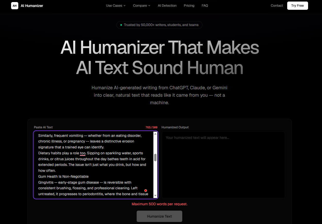 This tool allows you to humanize up to 500 words, three times a day, at no cost, and without requiring you to register. You simply copy and paste your content and receive the rewritten version immediately.