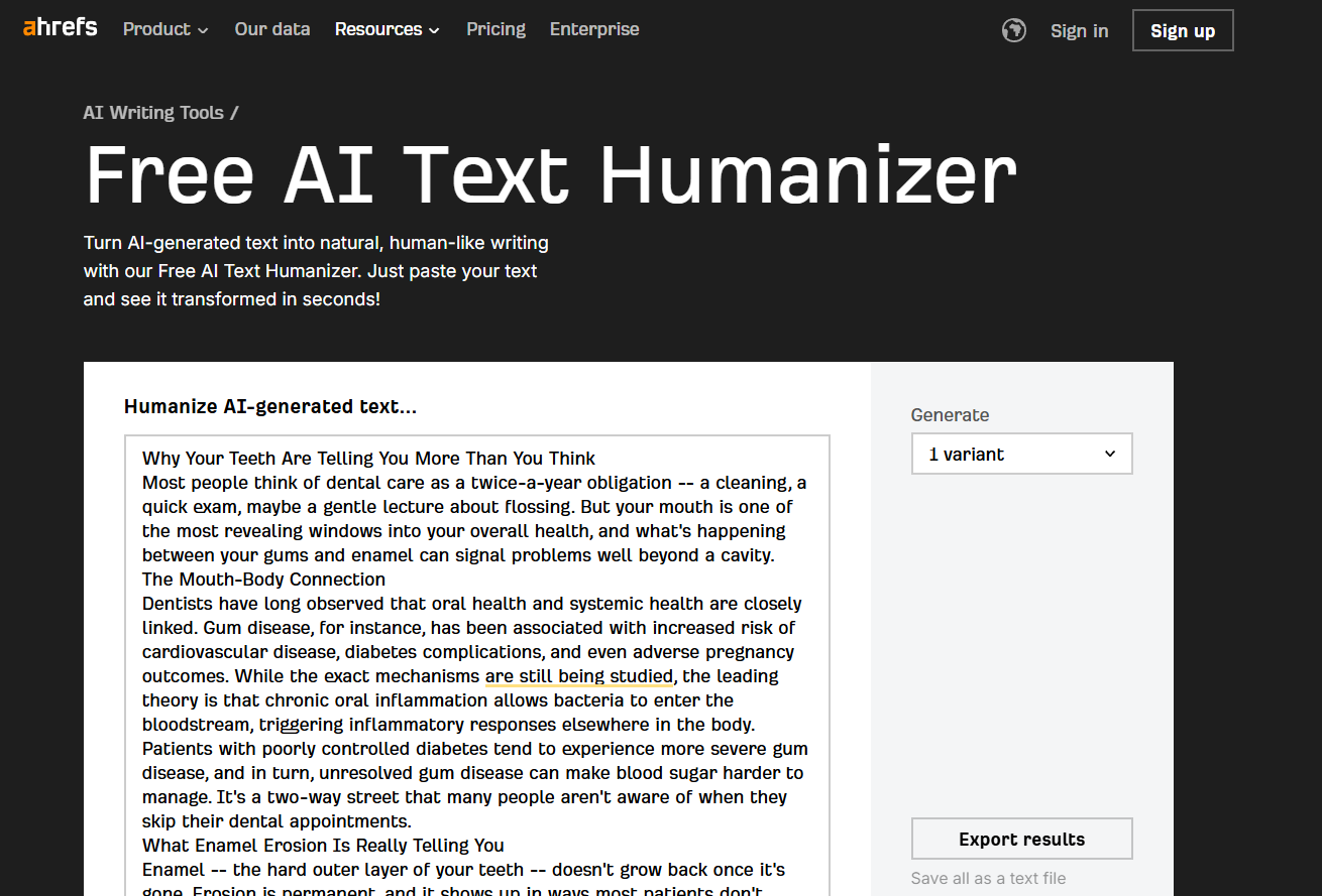 Ahrefs' humanizer is part of a broader suite of SEO writing tools, which makes it a logical choice for health marketers and content strategists who are considering both the accessibility of their content and its search visibility simultaneously.