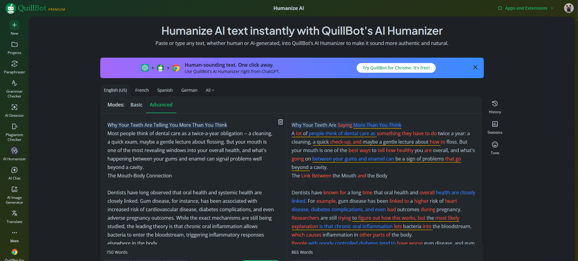 For healthcare writers who are consistently rewording sourced material, clinical summaries, and research abstracts into understandable language for various audiences, QuillBot's approach to humanization, structuring each sentence individually, provides granular control over the output.