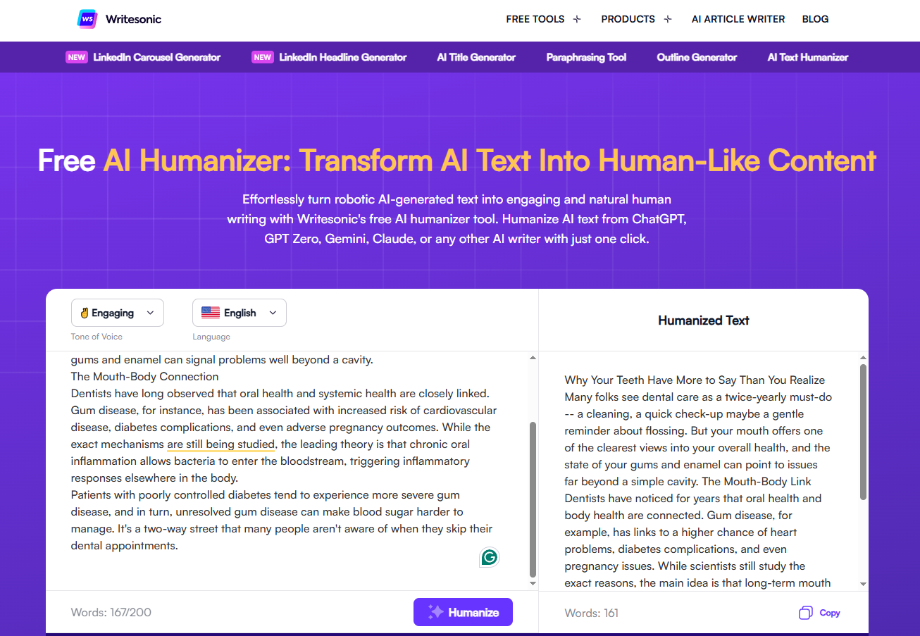 Writesonic provides more of the content development pipeline than most of the tools listed here. It can create drafts and then humanize them on the same platform.