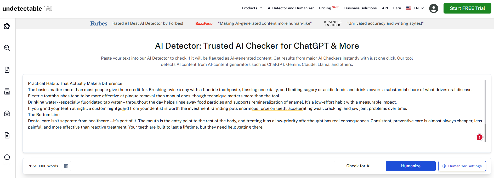 Undetectable AI is the most aggressive humanizer on this list in terms of its focus on avoiding AI detection.